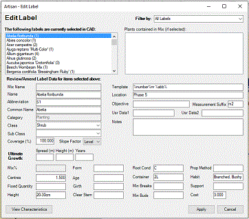 Labels - attach planting labels to single, linear, area planting geometry and modify existing label information using the Artisan Edit and Substitute tools. The Plant Browser tool provides a centralized tool to view and manage Artisan Objects in the current CAD model.