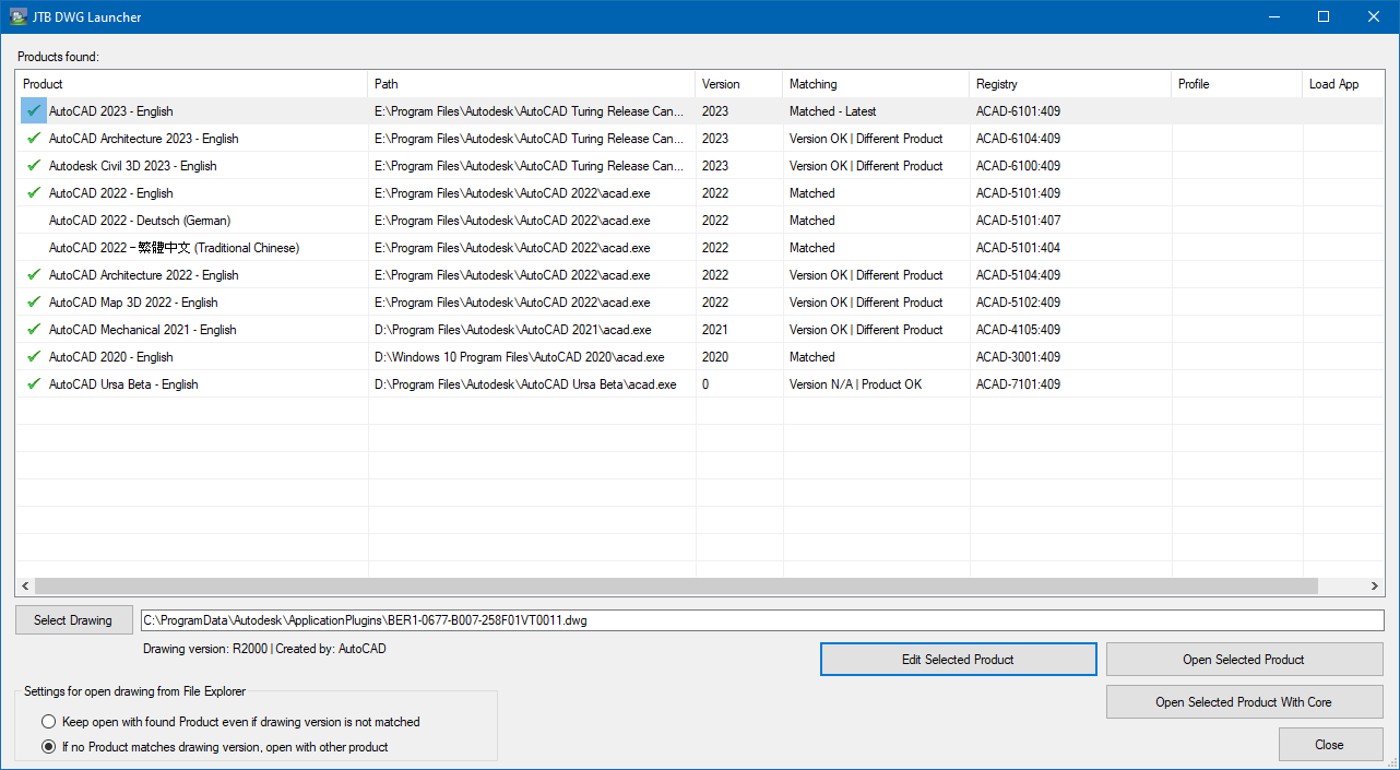 JTB DWG Launcher helps you to resolve this issue. JTB DWG Launcher knows what the drawing's version is, and what the CAD product it was created with, and from a list of many CAD products installed in your PC, JTB DWG Launcher picks up the right one to launch.