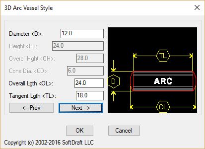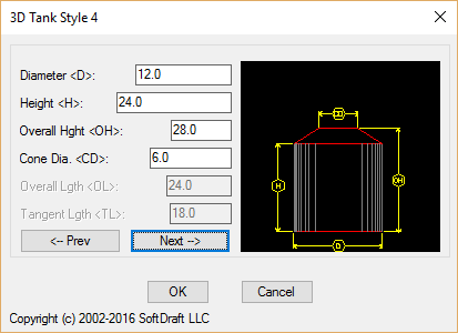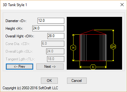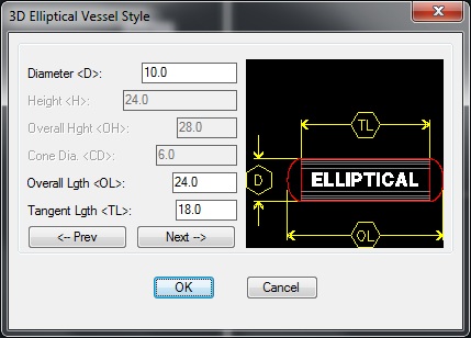 Tanks 3D provides a parametric library including five vertical tank styles and three horizontal vessel types. The program has a simple dialog box interface allowing the user to specify the dimensions before placement.