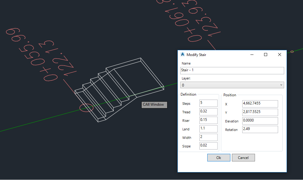 The Land[x] stair plug-in provides tools for creating and editing simple parametric staircases in Autodesk® Civil 3D®. The staircase is an Autodesk® AutoCAD® 3D solid and the parameters (height of riser, length of tread, width, landing and slope) are stored in a property set attached.