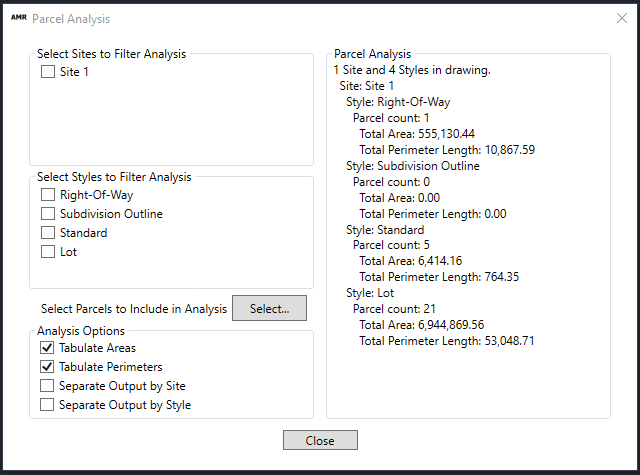 This app will allow the user to filter parcels by site or style, select specific parcels and filter the output information for areas or perimeters of parcels.