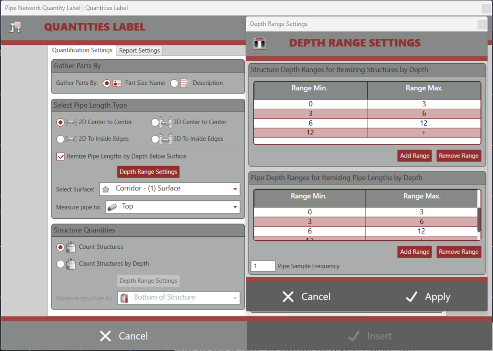 Pipe depths are summarized by sampling the pipe elevation at specified location of pipe vs the surface at a controllable sample frequency. Structure depths off multiple depth choices. Reports are summarized by parts of like PartSizeNames or Part Descriptions to help gain a summary of the design. Selection of parts is done with 5 methods: selection methods: All, Network, Multiple, Alignment and Path.