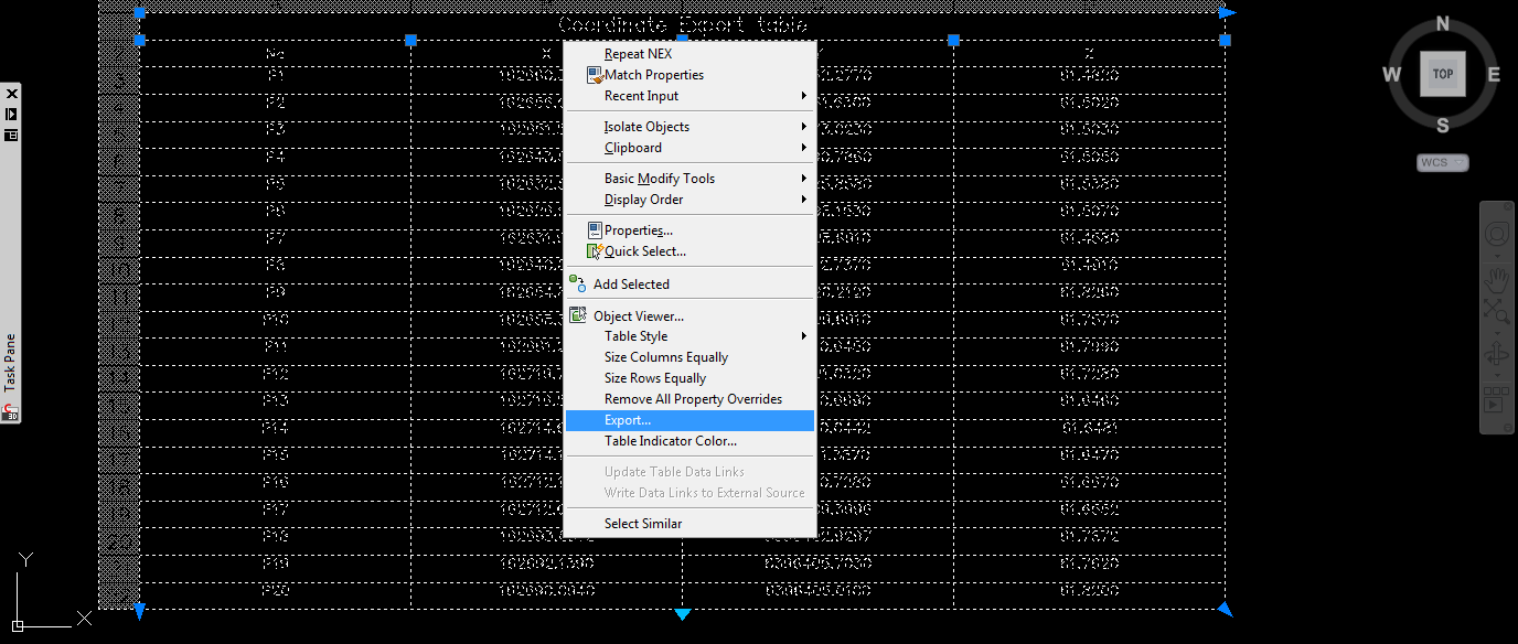 All selected points will be converted into the numbered blocks then you can convert all point coordinates to Autodesk® AutoCAD® table format and coordinates table can be exported as a CSV file.