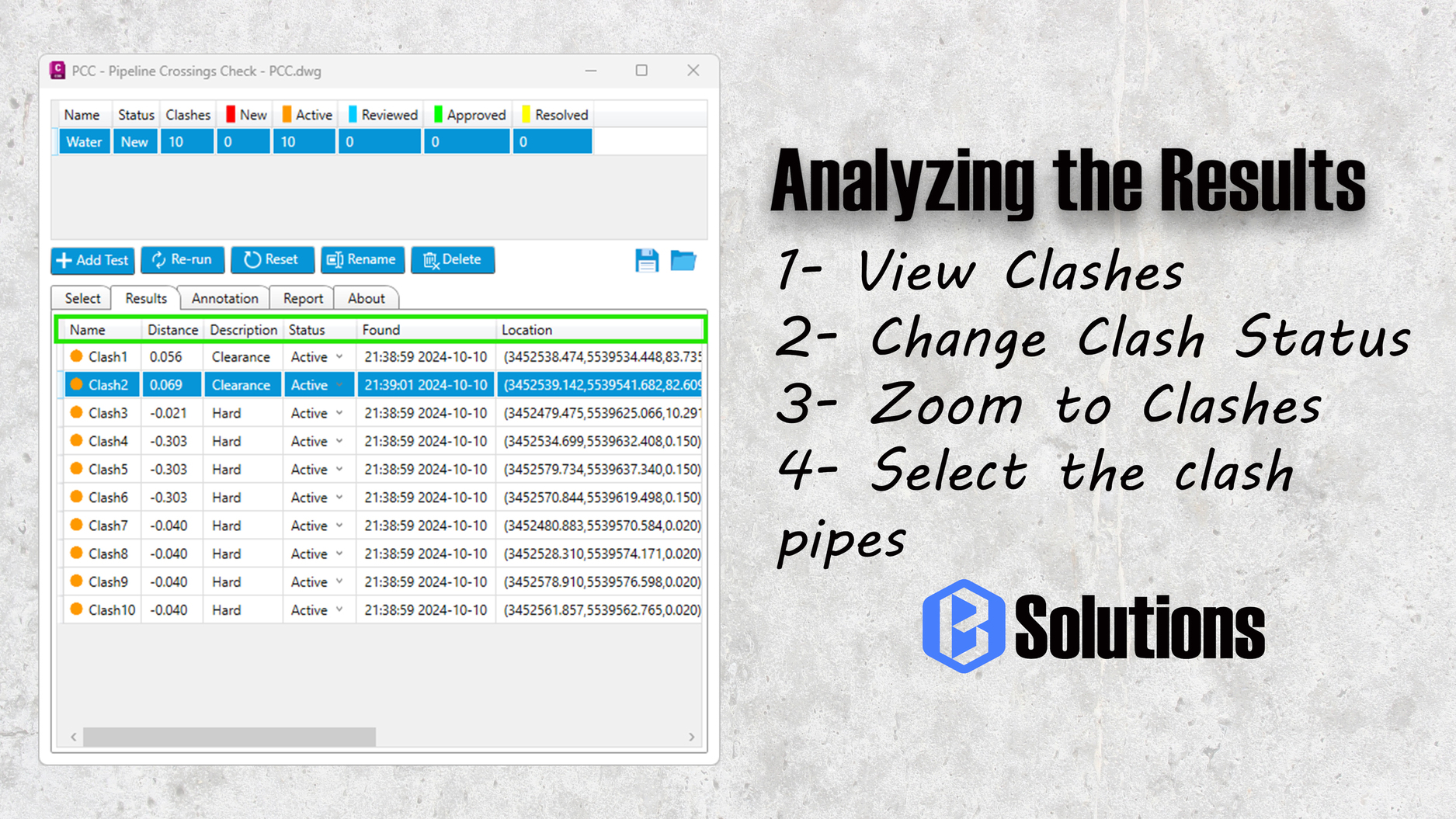 PCC - Pipeline Crossings Check is a powerful plugin for Autodesk® Civil 3D® designed to save time and effort in checking pipeline crossings. It can detect both soft and hard clashes during modeling. The plugin offers a user-friendly interface, simplifying the selection of Gravity Network or Pressure Network, and checks for clashes where they intersect. The results are displayed in a table, and clashes can be labeled in the model.