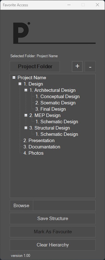 PFolders is an essential productivity tool for architects, engineers, and design professionals who manage multiple projects in Autodesk® AutoCAD®. Organize your project environments, standardize folder hierarchies, and access your most-used locations with one click—all without leaving AutoCAD’s interface.