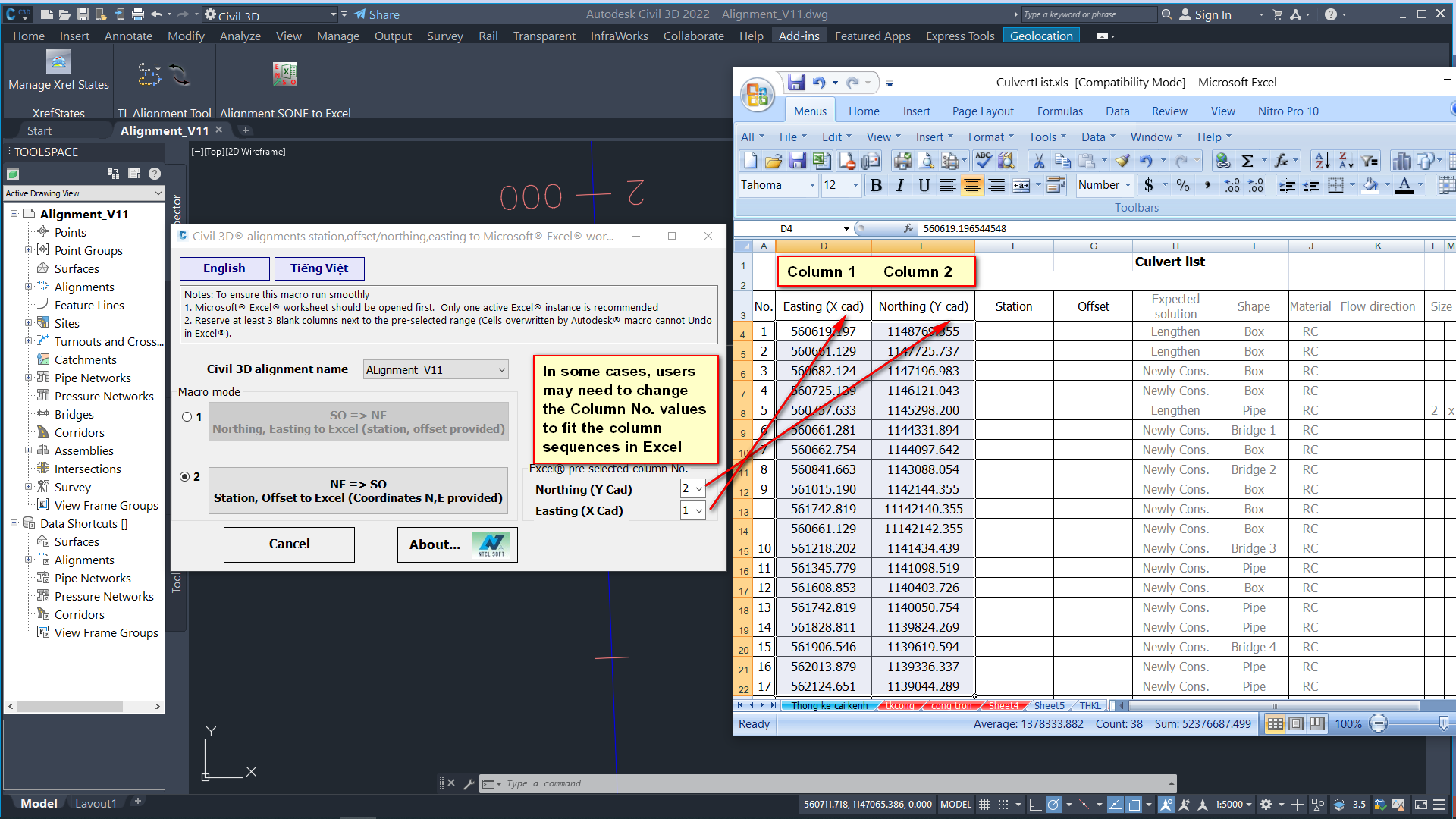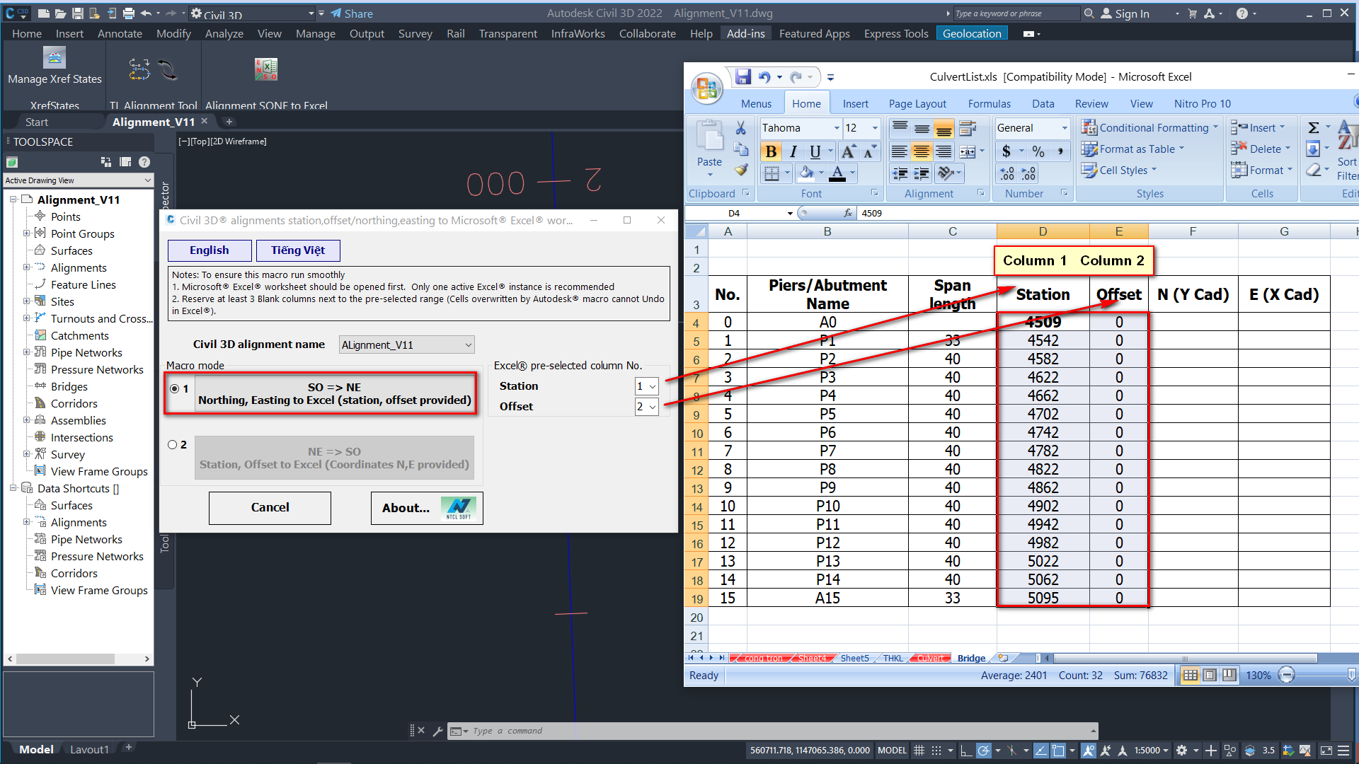 Input (SO or NE) and output (NE or SO) values are taken from and returned to the Excel® worksheet for further processing. This tool may help ease the process of enumerating/ sorting structures located along horizontal alignments such as culverts, signs, abutments, and piers... The structure location list in Excel can be saved and reused to create attribute block instances later.
