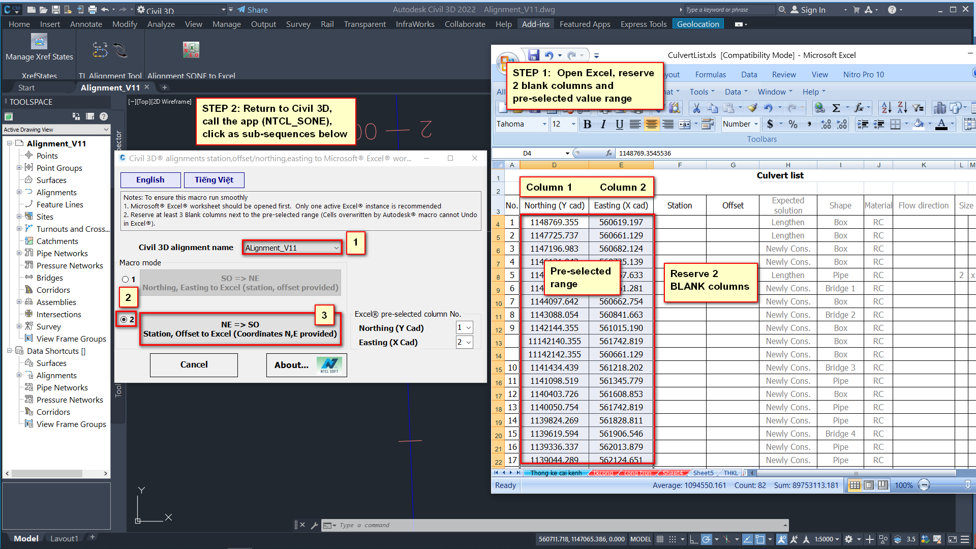 This app aims to batch inquiry Autodesk® Civil 3D® alignment Station, Offset (SO) based on pre-selected Northing, Easting (NE) values and vice versa. Results are directly exported to Microsoft® Excel® worksheet.