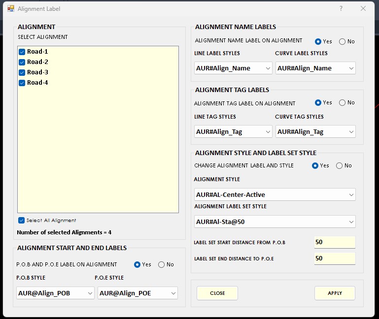 With the help of this plugin, you can add setting-out details to multiple alignments.
