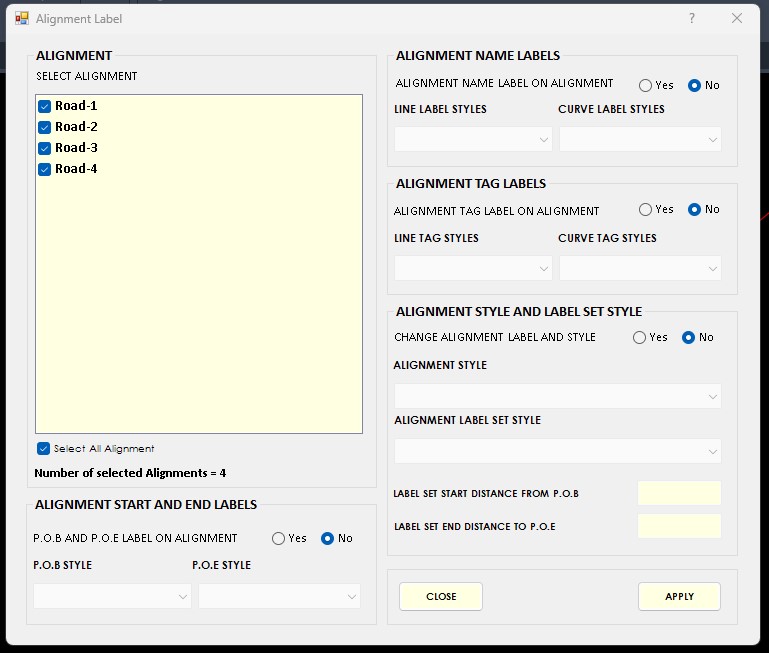 For the alignment label styles you need to save a label set style then you can add to all alignments with the help of this plugin.