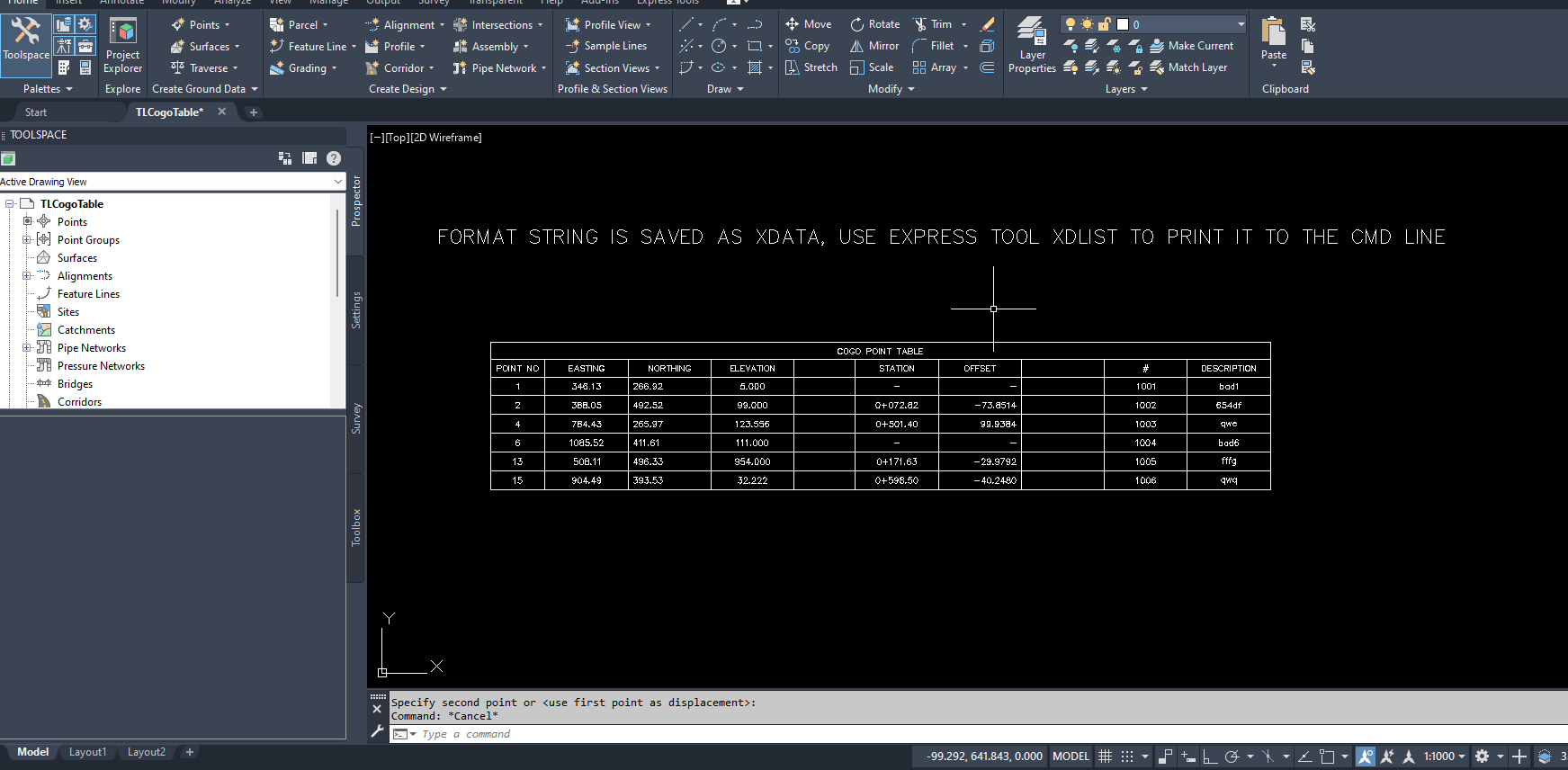 - No cogo table styles required - table format is specified in the initial format string, existing acad table style is used