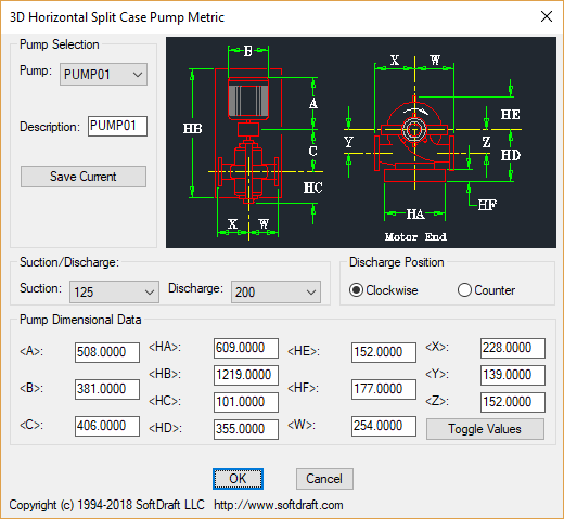 Horizontal Split Case Pumps creates a wide variety of 3D pumps from pump manufacturer data sheets, by inputting the dimensional data for each pump dimension. Dimensional data may be saved for future use and then recalled in a different drawing file. Two different discharge positions include clockwise and counter clockwise. Suction and discharge selections range from 25mm to 350mm.