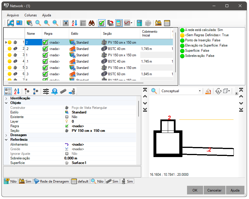 Cotas de montante ou jusante podem ser modificadas graficamente ou manualmente, em vários ou um trecho por vez. Seções podem ser arbitradas em um trecho e os subsequentes serão alterados automaticamente. Os PVs serão substituídos para que sejam compatíveis com os tubos que chegam até ele.