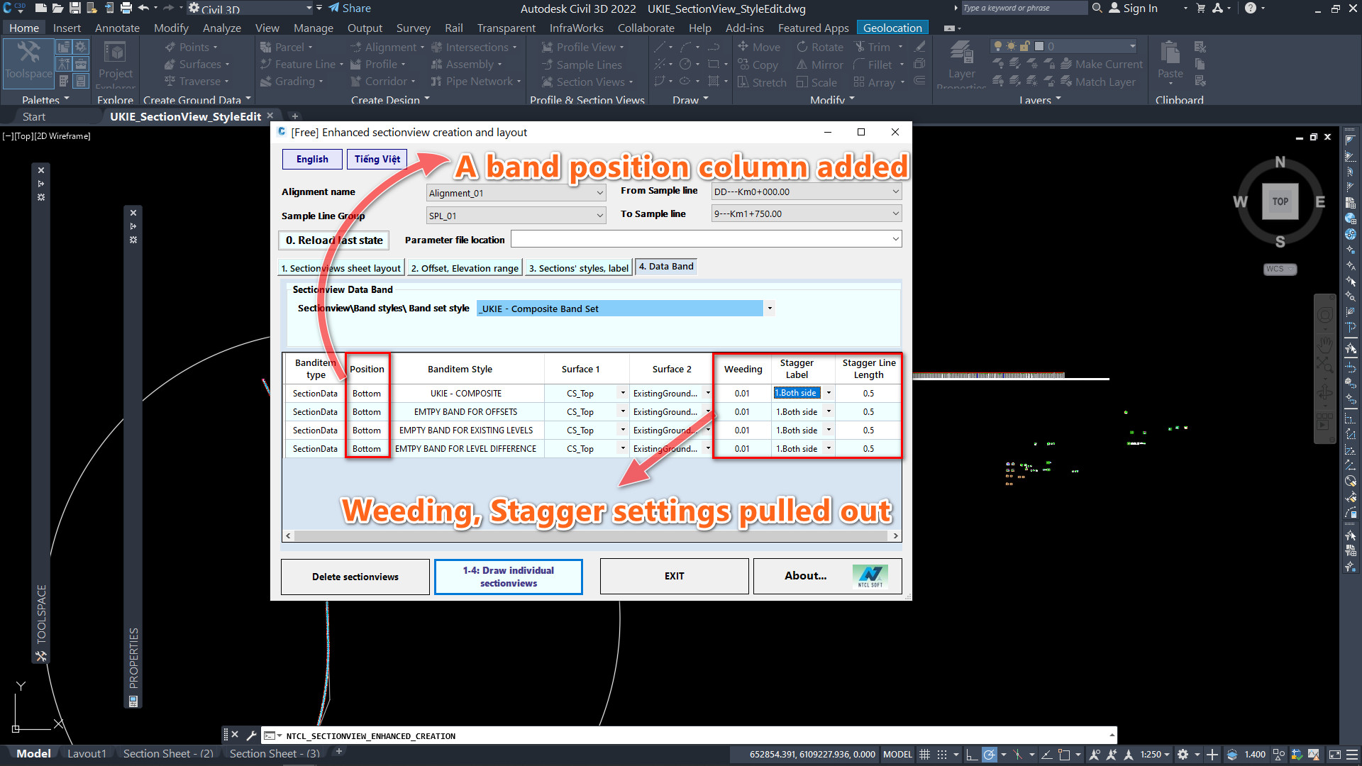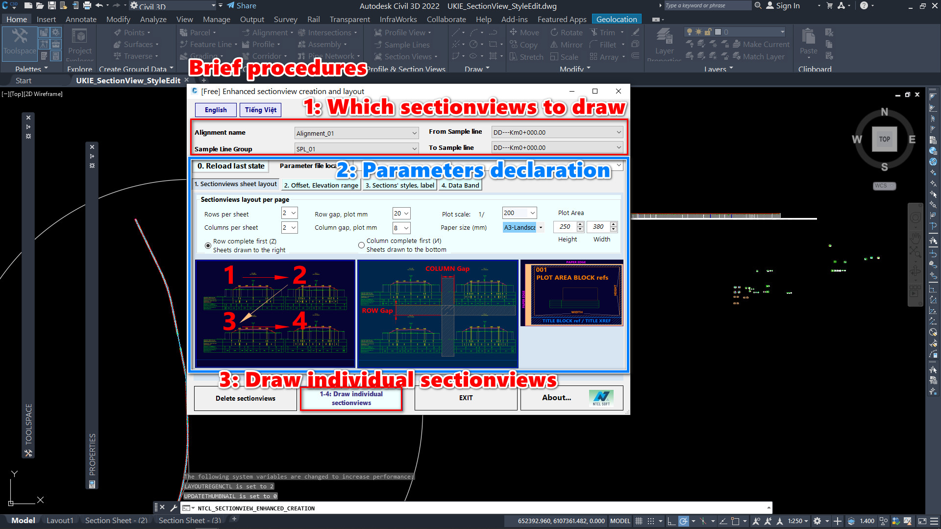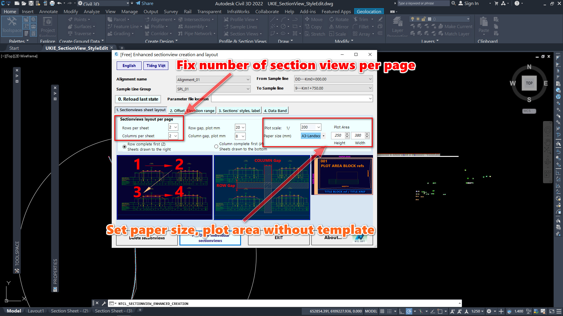 - Each section view can be manually moved to another position. Position not changed after an update event (eg: annotation scale changed, nearby section view deleted);