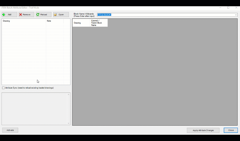 This batch attribute editor app for Autodesk® AutoCAD® collects attributes in all blocks of specified name patterns in multiple drawings and displays them in a wide spreadsheet. Then, you can edit attribute texts as easily as working with Excel. Once done, click "Apply Attribute Changes" to update the values to drawings.