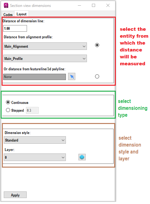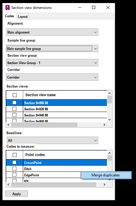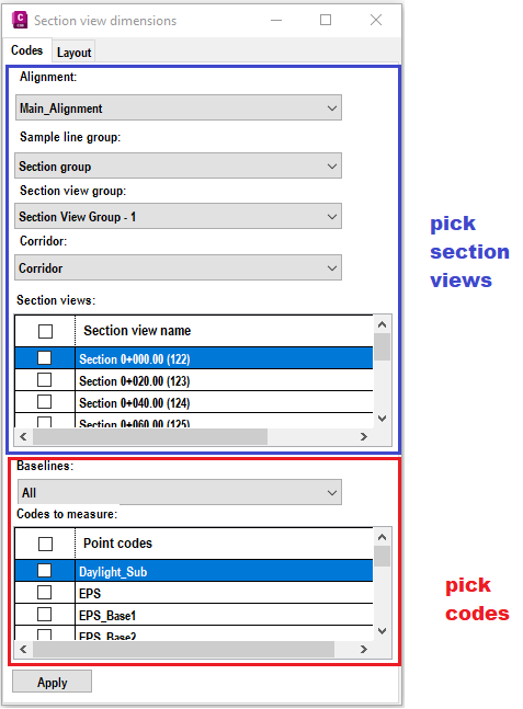 Based on the selection of the corridor and the codes of that corridor, our plug-in will calculate and display the distances in the selected dimension style on section view and put them in the layer you choose.