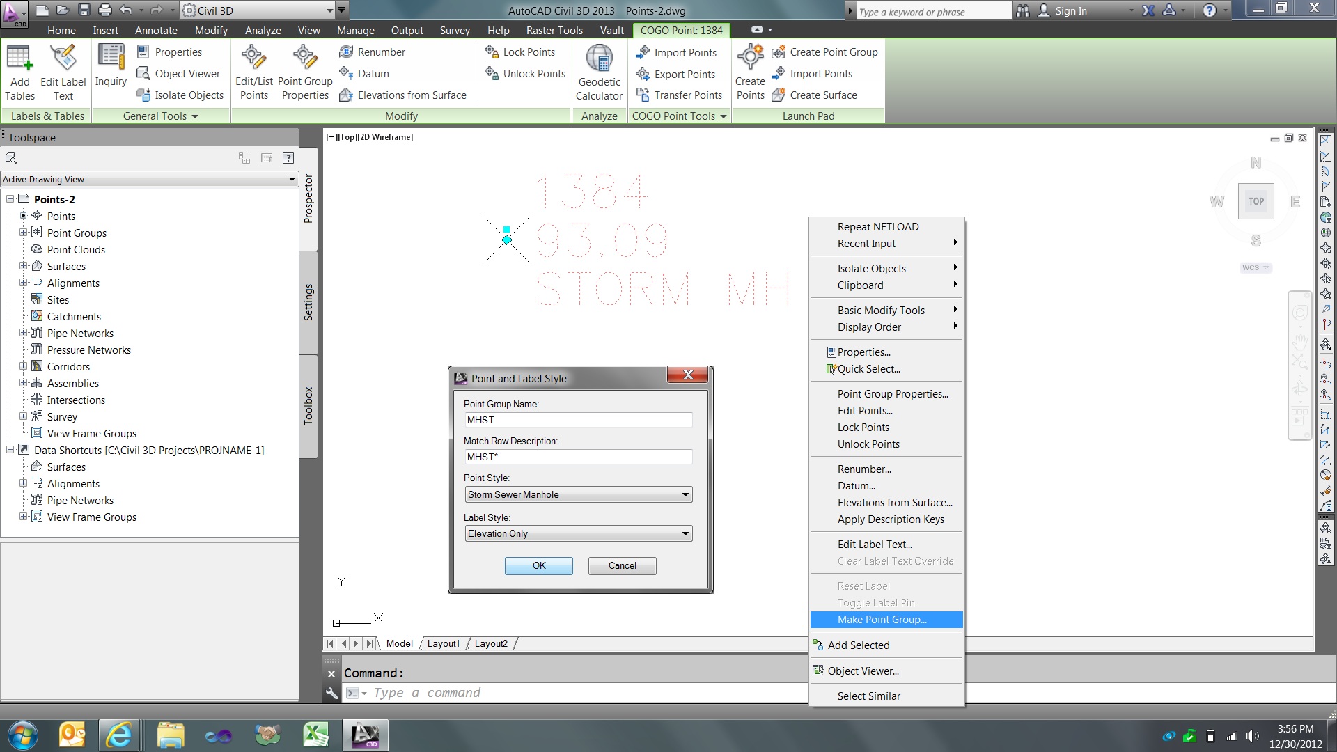 This allows the user to quickly create point groups for survey points such as trees, catch basins and other features by right clicking each desired point to be made into a point group based on its description.