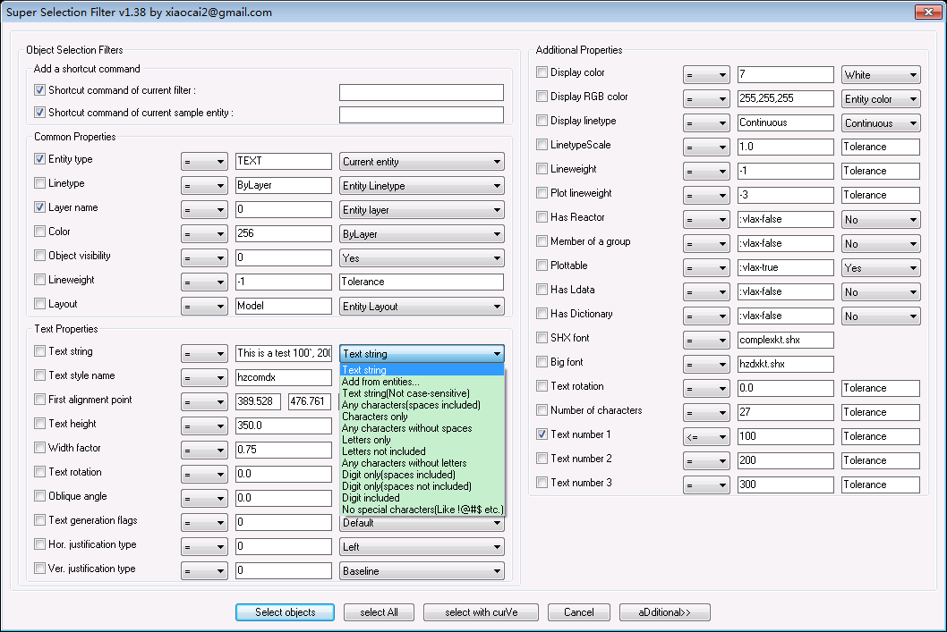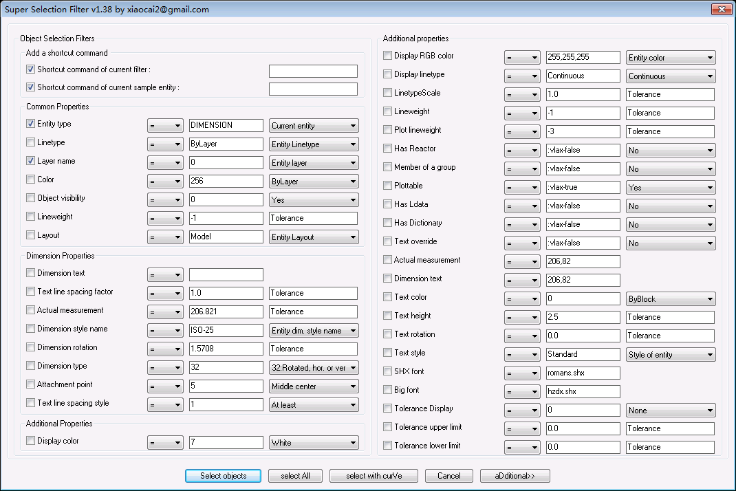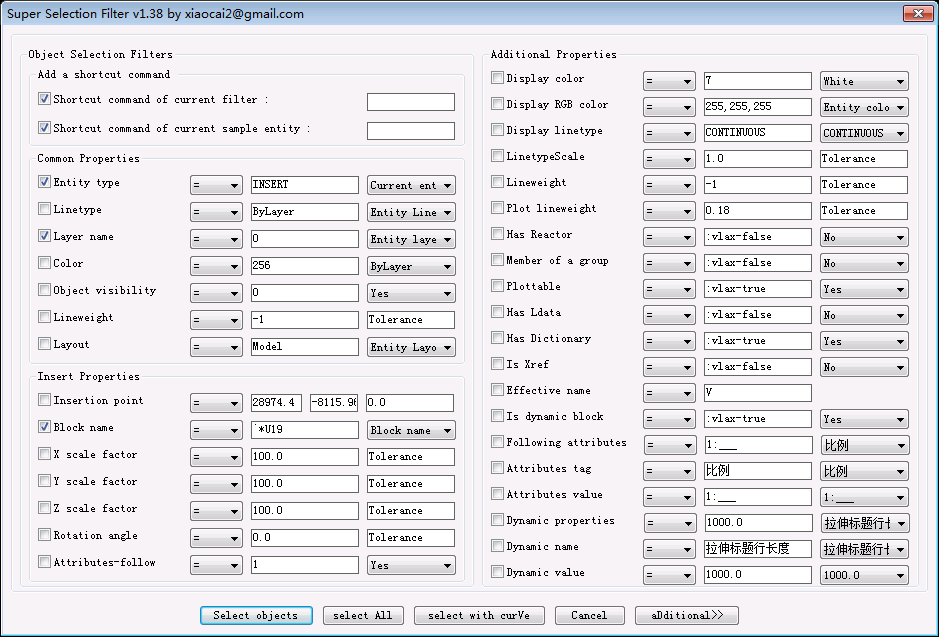 This app is useful to filter out those specific entities based on the properties of the selected sample entity, even the properties are not available in SelectSimilar and QSelect. Such as attributes of blocks, the effective name and parameters of dynamic blocks, RGB colors, array rows and columns, the number of vertices in a polyline, all nested blocks include the sample block, and so on.