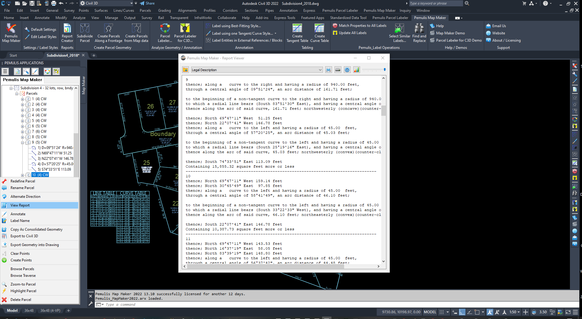 Find and fix geometry errors. For example, Pemulis Map Maker identifies where the sum of partial lengths doesn't add up to the overall length, or identify possible errors in the display of delta values in Civil 3D.
