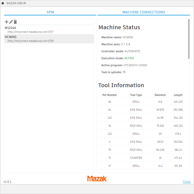 The add-in also allows you to connect to your Mazak machines through the MTConnect protocol to view the current status of the machine. Check if the machine's controller is in automatic or manual mode, whether it is currently running a program and check the active program that is running from within Fusion.