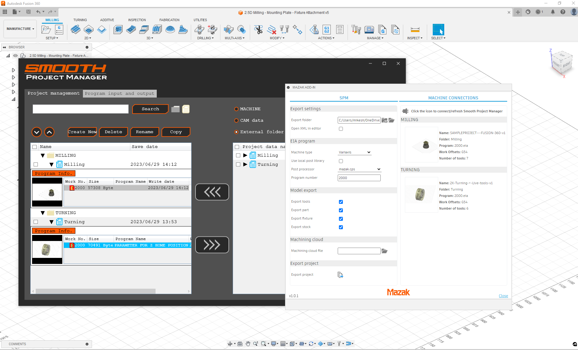 The Mazak Add-In allows you to post your EIA program and export tool, part, fixture and stock geometry from Autodesk® Fusion® into a folder which can be transferred to your Mazak machines or to Mazak Smooth CAM Ai through the Mazak Smooth Project Manager.