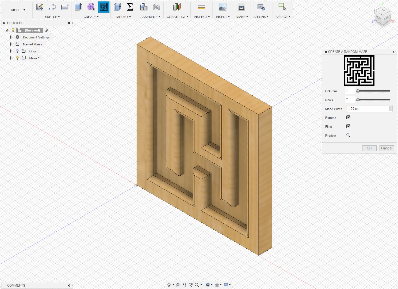 The random 3D maze is automatically generated from user-specified columns and rows. There is also an option to change the width of the maze "path" and add a fillet to the path edges.