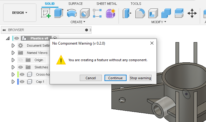 An Autodesk® Fusion 360™ add-in that warns when features are created outside components. It also warns when creating a feature across components (It works if the reference feature is selected before creating the new feature).