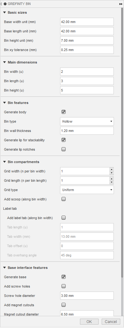This tool is amazing - I was able to quickly create many different forms of gridfinity bins that fit into the baseplate perfectly - there are many options to choose from including magnetic base, automatically placing extrusions for engravings or tags to indicate certain things, solid, hollow or shelled bodies - has been extremely useful so far. Thanks so much for making this great tool!