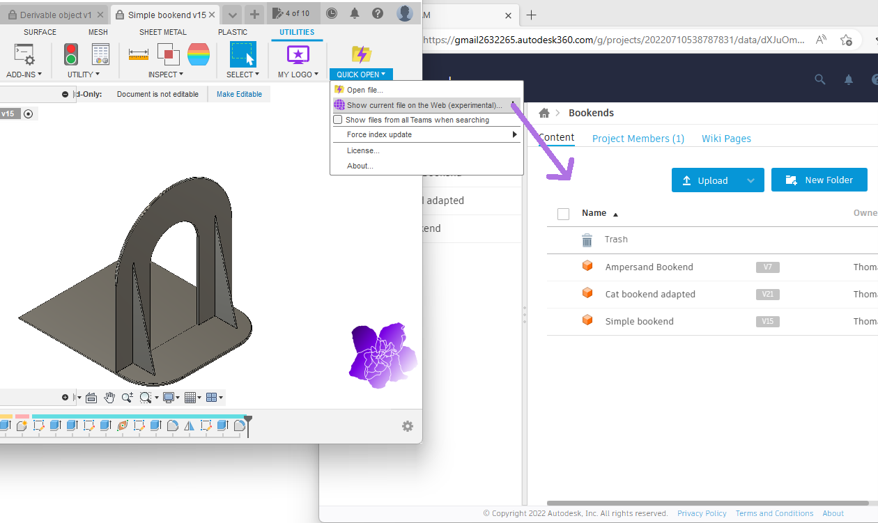 |   | Show current file on the Web... | Opens Autodesk Drive in a web browser and shows the folder of the file currently open in Autodesk® Fusion®. This feature is experimental. |
