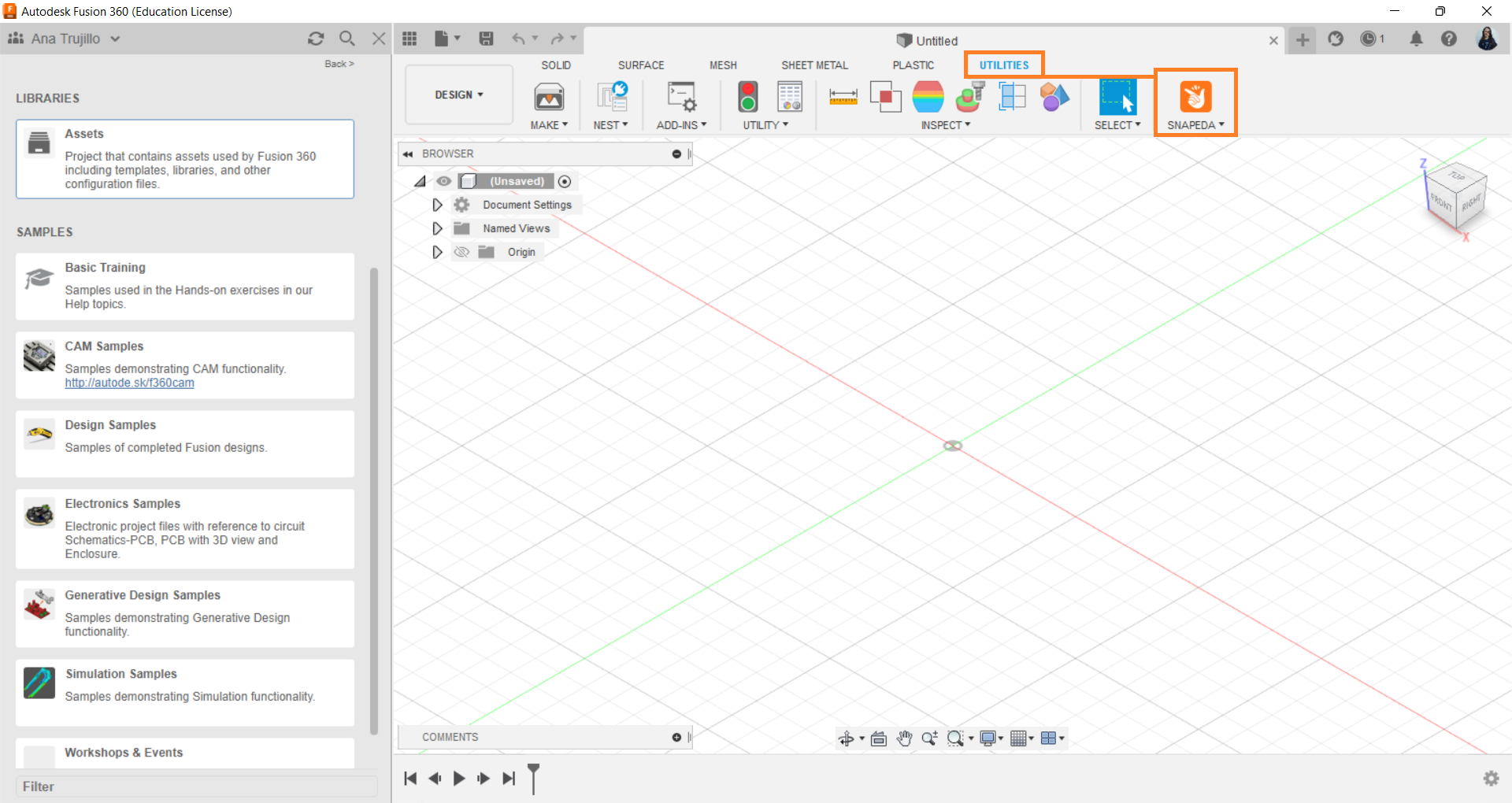 - On the New Design Tab, go to Utilities. Click the SnapEDA Icon to run the plugin. Note: You can also access the plugin by going to File > New Electronics Design > New PCB > Tools.