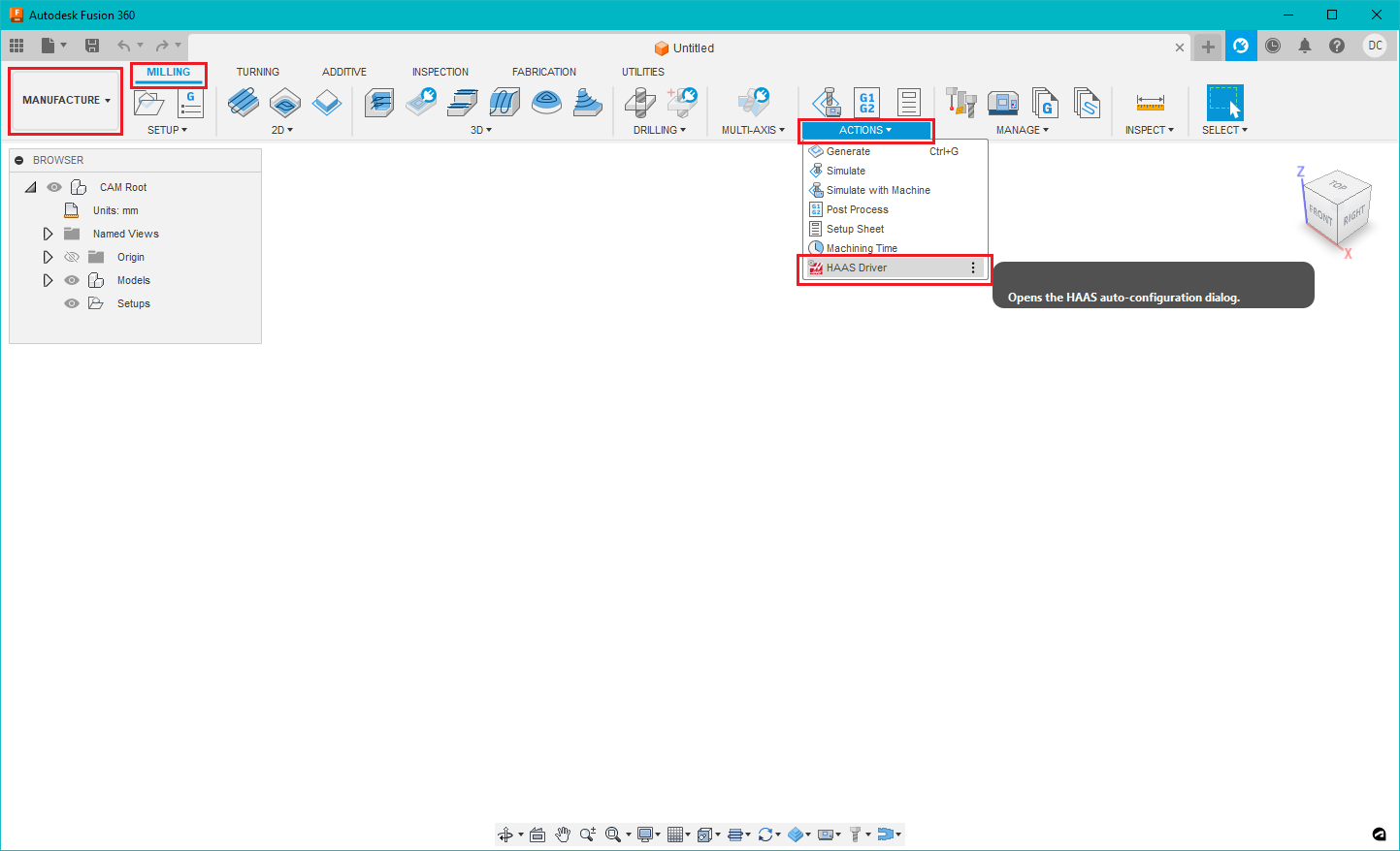 The Fusion menu bar may change to Milling, select Milling if it does not.