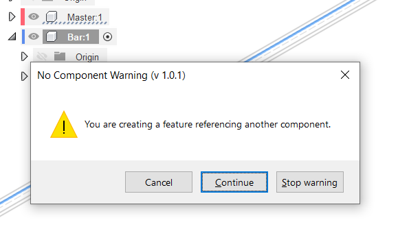 An Autodesk® Fusion 360™ add-in that warns when features are created outside components. It also warns when creating a feature across components (It works if the reference feature is selected before creating the new feature).