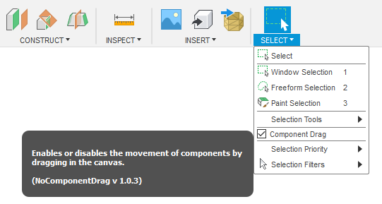 This is a simple, non-intrusive add-in that only adds one button (under the 'select' panel). Disabling the component drag allows you to freely click and drag anywhere on the screen without worrying about accidentally moving entire components without realising.
