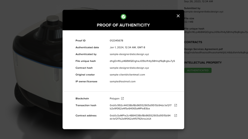 Final Design provides a single source of truth for all your critical data, including design files, legal contracts, and IP documents. Our platform ensures your data is securely authenticated and stored in a tamper-proof, traceable format, giving you full control and oversight. With our smart contract technology, your information remains protected—never altered, lost, or dispersed—safeguarding both the integrity of your data and your IP ownership. This allows for seamless collaboration with stakeholders while maintaining the confidentiality and security of your information.