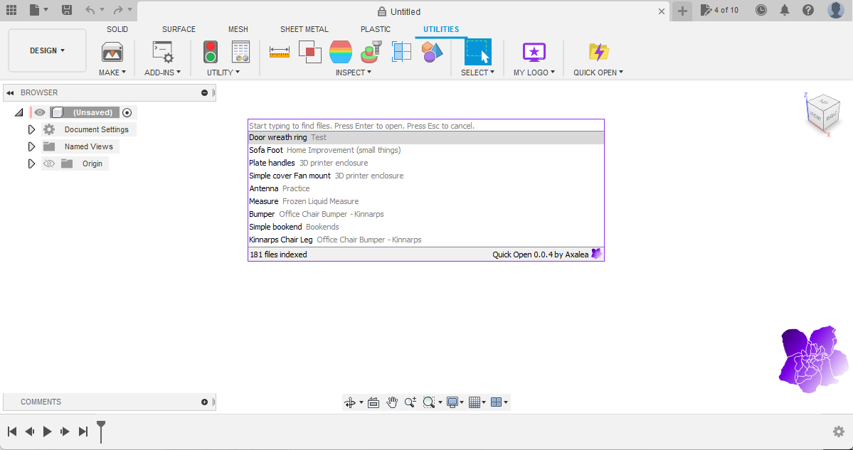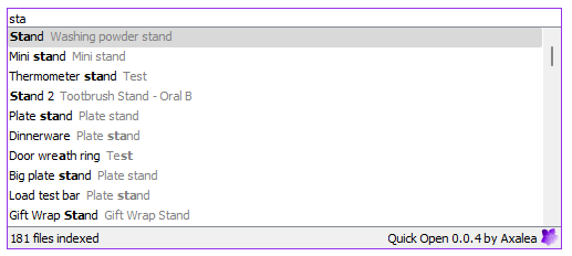 Quick Open lets you quickly open files in Autodesk® Fusion®. Just press a hotkey and type some letters of the filename - Quick Open will present a list of matching files, just as in Microsoft® Visual Studio Code or Sublime® Text (no affiliations).