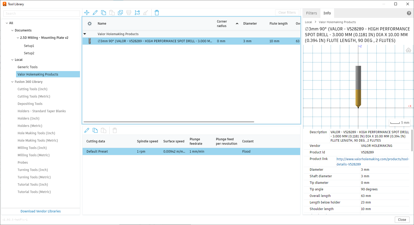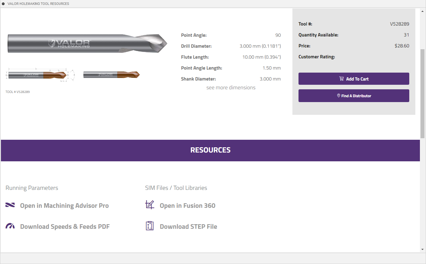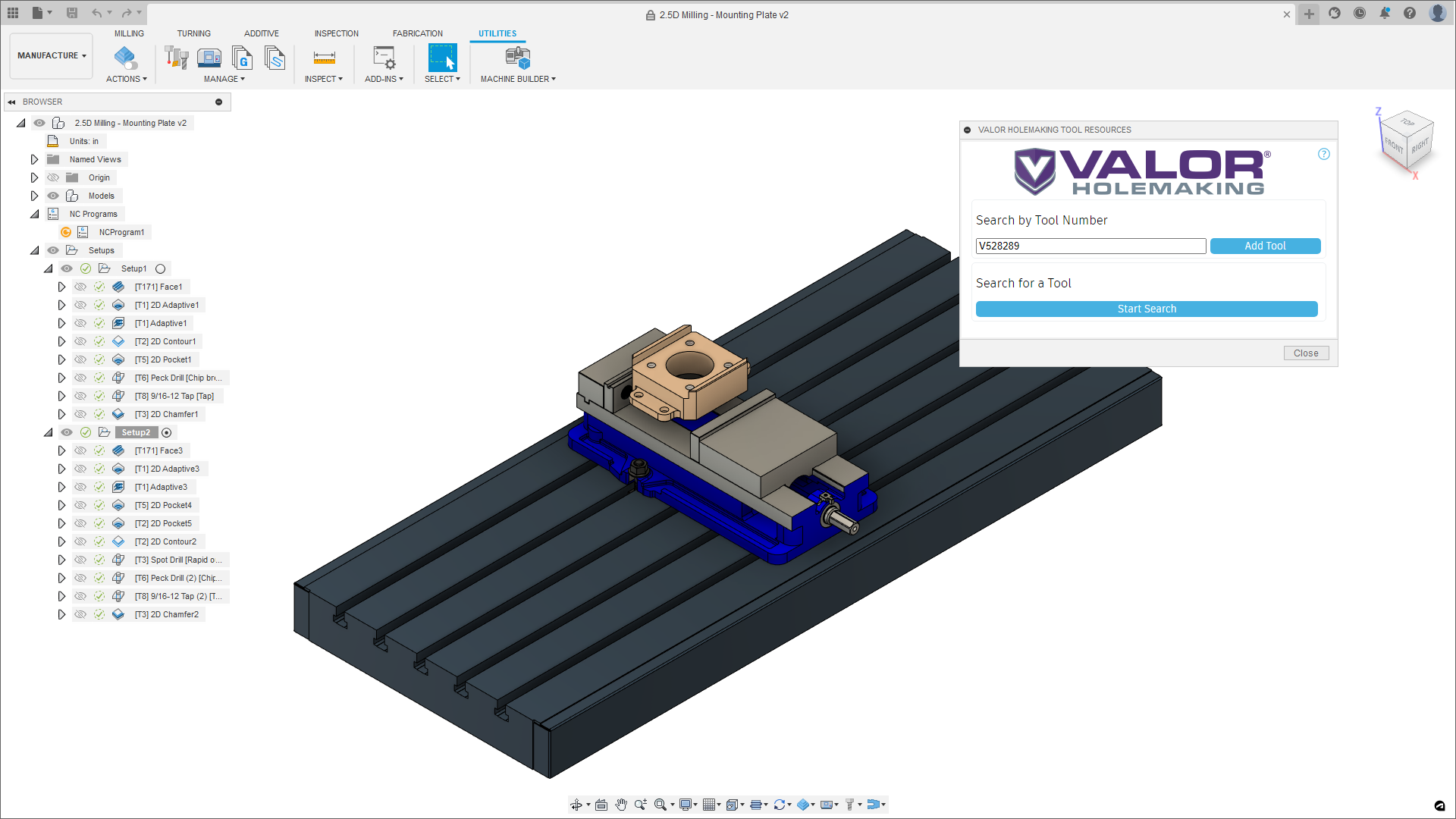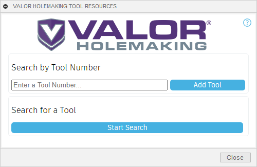 The Valor Holemaking Resources add-in provides a user-friendly interface that allows you to download Valor Holemaking tools into your Autodesk® Fusion® tool library.