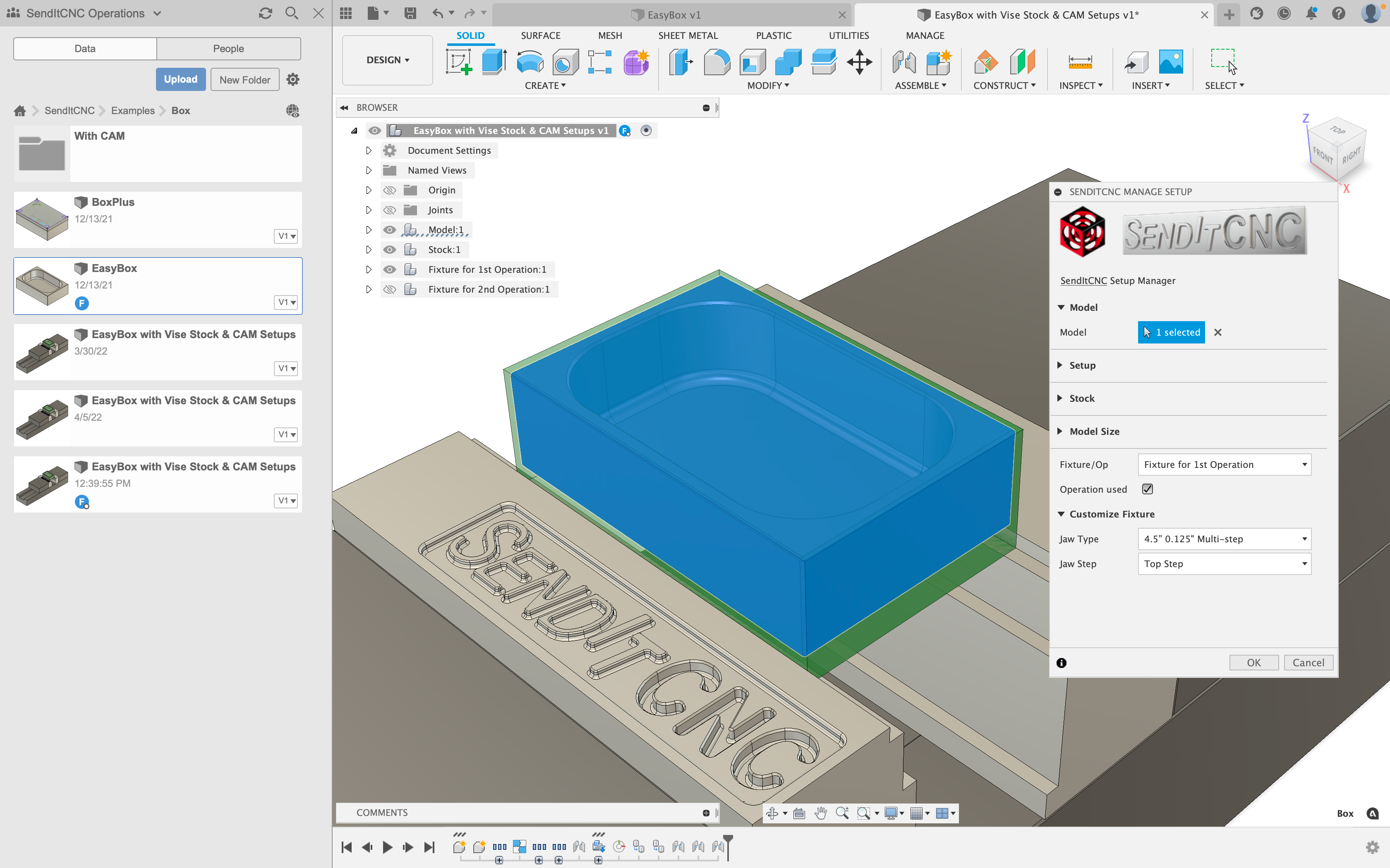 The SendItCNC add-in's Manage Setup command will automatically create a CAM setup for your part design, complete with workholding, stock model, and a starter set of CAM operations. This setup can be used to submit a job to a cloud CNC machine or adapted for use with your own local, in-house CNC machines.