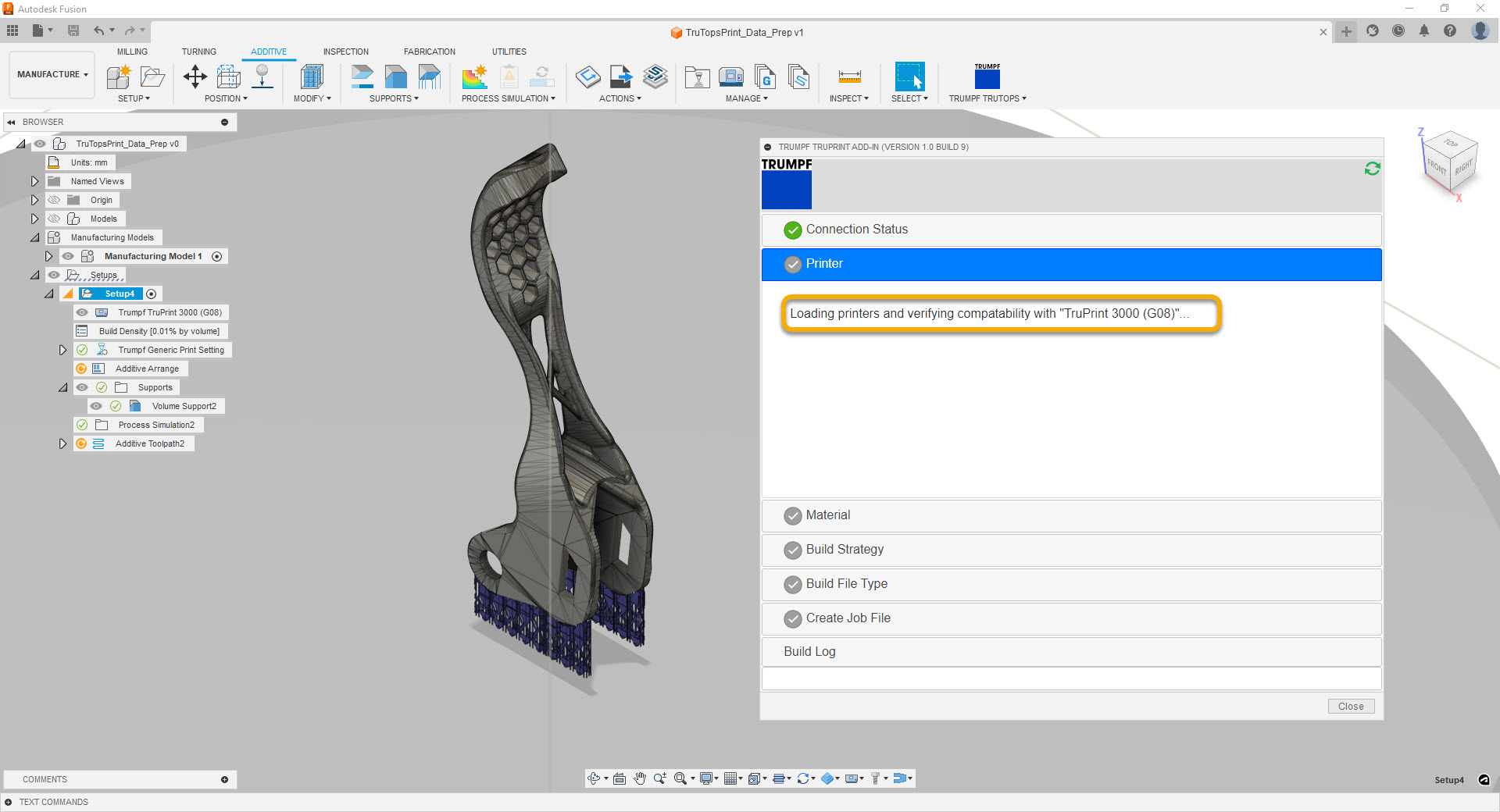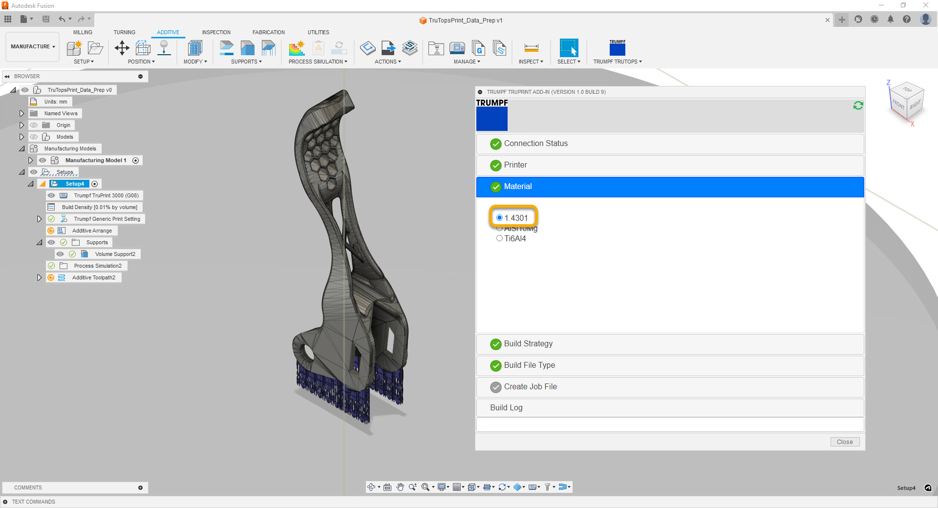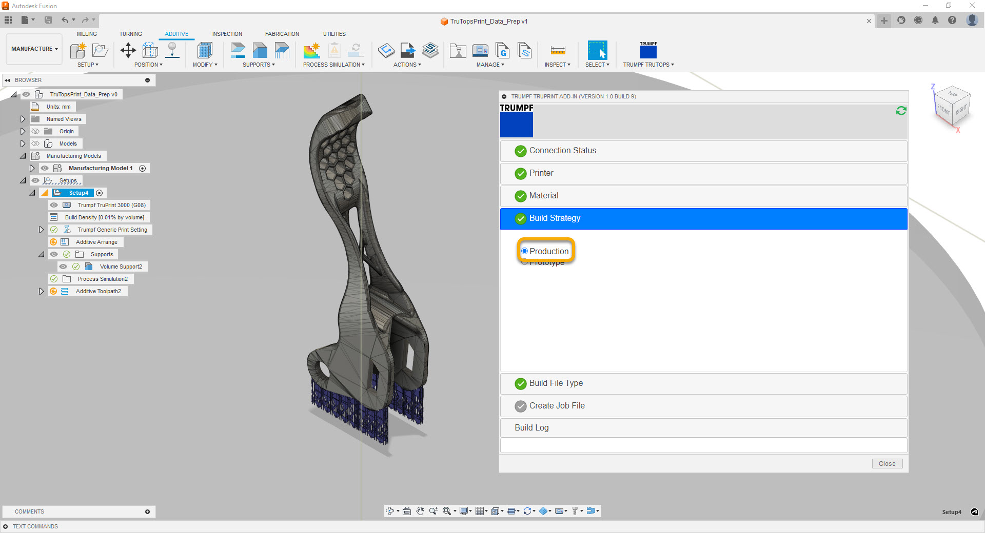 This App connects your Fusion Additive Setup to the TruTops Print Service. Once you are done with part positioning and support generation, you can assign your customized Material and Parameter Profiles, apply the original hatching algorithms of the TruTops Print Service, and export the slice data as a .WZA build file.