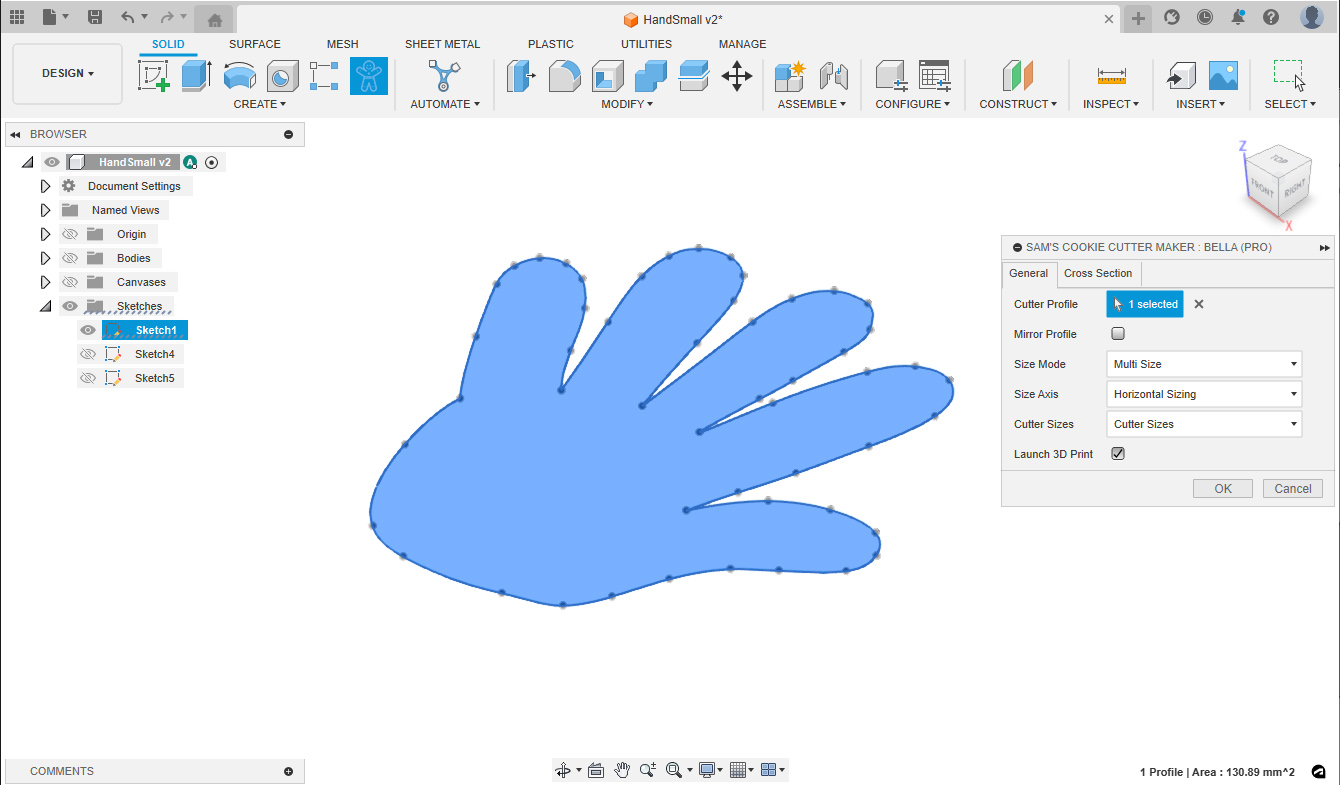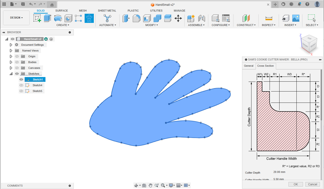 Having to use different programs to do each different step can be cumbersome and time-consuming. This add-in allows you to use Autodesk® Fusion 360™ to sketch your 2D shape, then after clicking a couple of buttons, it allows you to create the 3D print file and open Cura to get the geocode and ultimately print your cookie cutter.