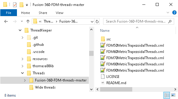 ThreadKeeper is an Autodesk® Fusion 360® add-in that restores custom thread definitions every time they are removed (i.e. when Fusion 360 is updated).