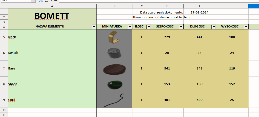 - Component thumbnail generation: The add-in creates thumbnail images of components (450x350 pixels) and places them in the generated Excel file. Visualization of components makes it easier to identify elements and speeds up work.
