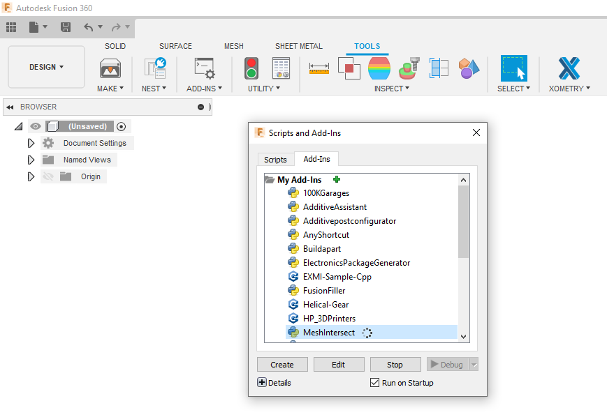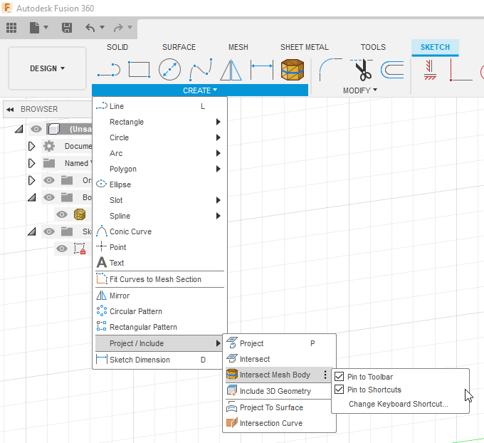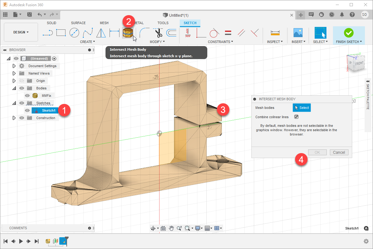 I am not able to select mesh body even in the browser, Please suggest me an workaround and if i select the select option, intersect mesh body option is closing.