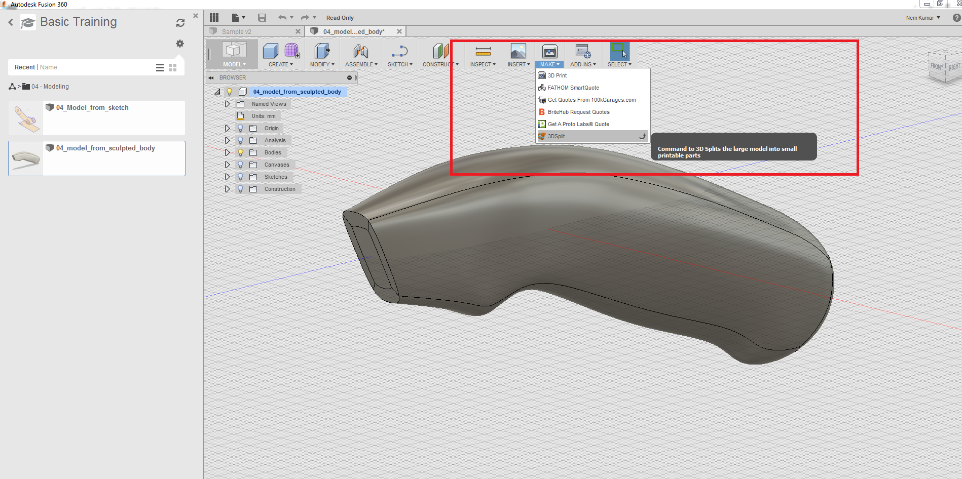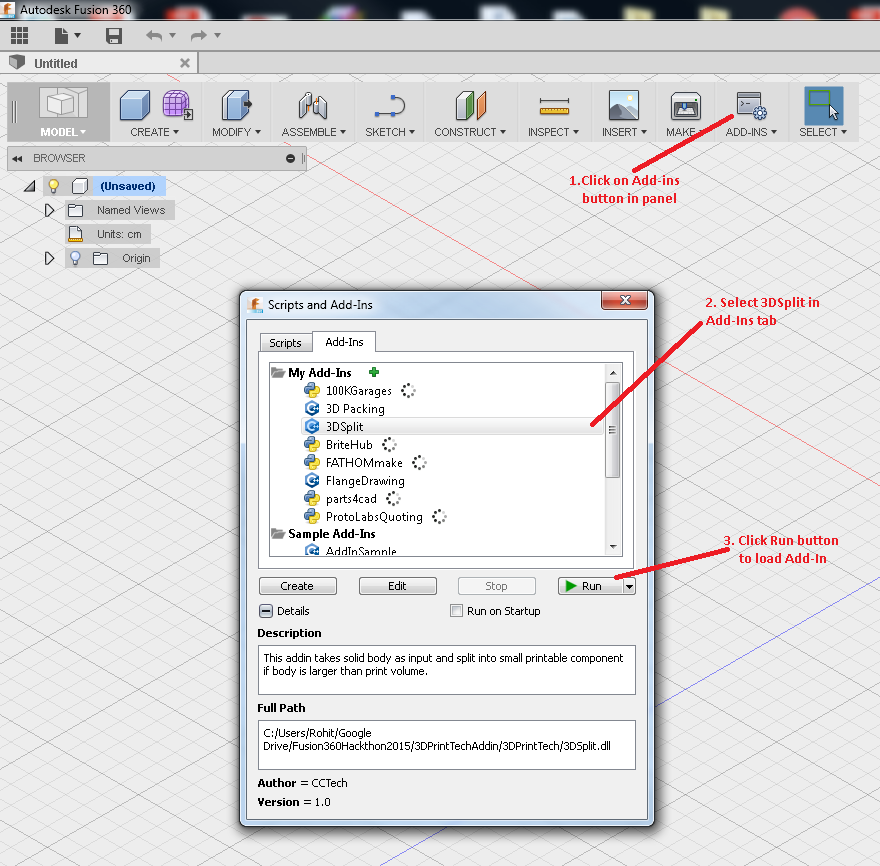 I've successfully used it: - Copy the files in C:\Users\USERNAME\AppData\Roaming\Autodesk\Autodesk Fusion 360\API\AddIns - Select the object you want to split and click "MAKE">"3DSplit" And it's done !