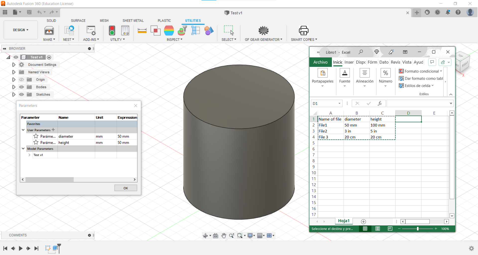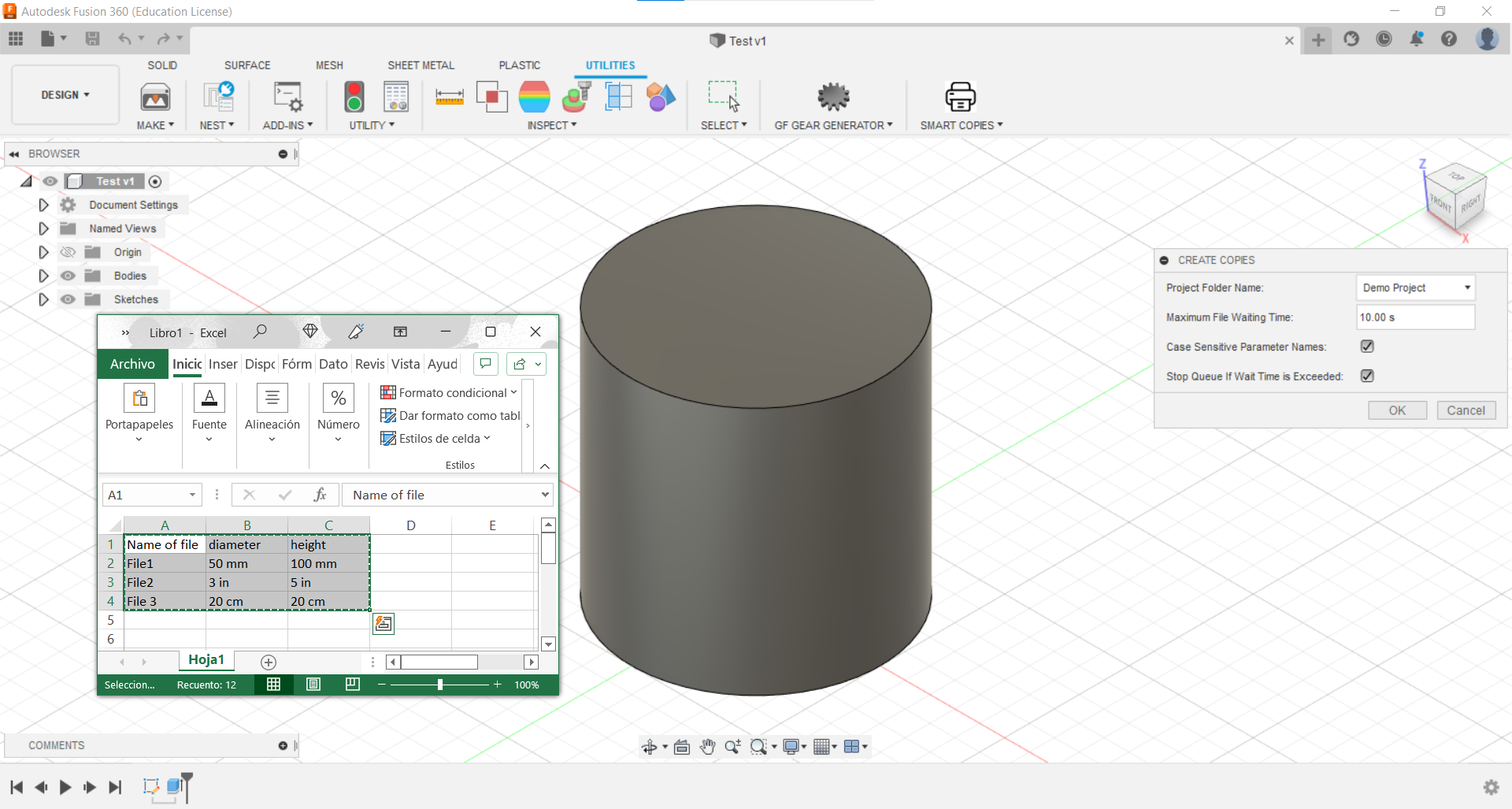 A valid Excel table is one whose column headers match the names of the defined user parameters of the active document (besides the “Name of File” special header) as well as Autodesk® Fusion 360™/ Unit parameter value expressions.