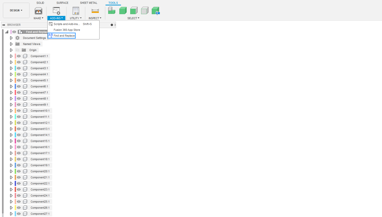 Find and Replace add-in finds and replaces text in names of components, bodies or sketches. This add-in allows you to specify text to find and replace. It has options to include components, bodies, sketches, hidden entities, and match case.