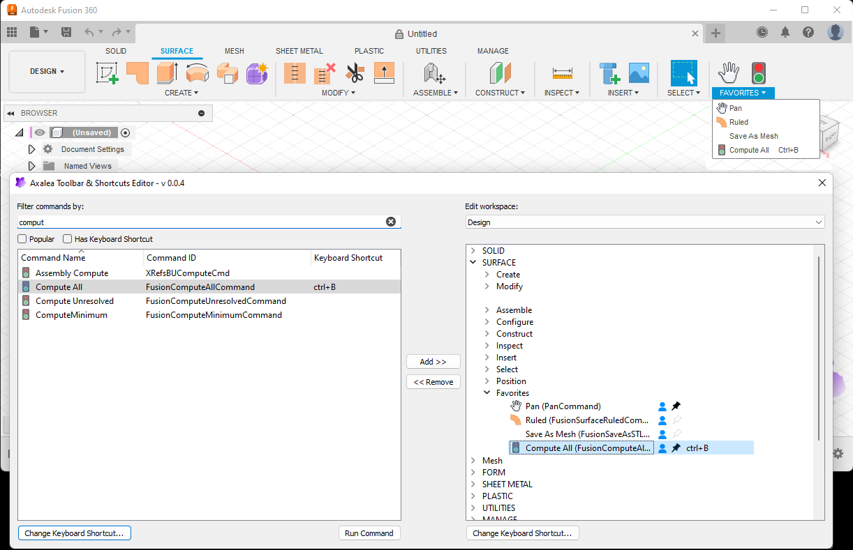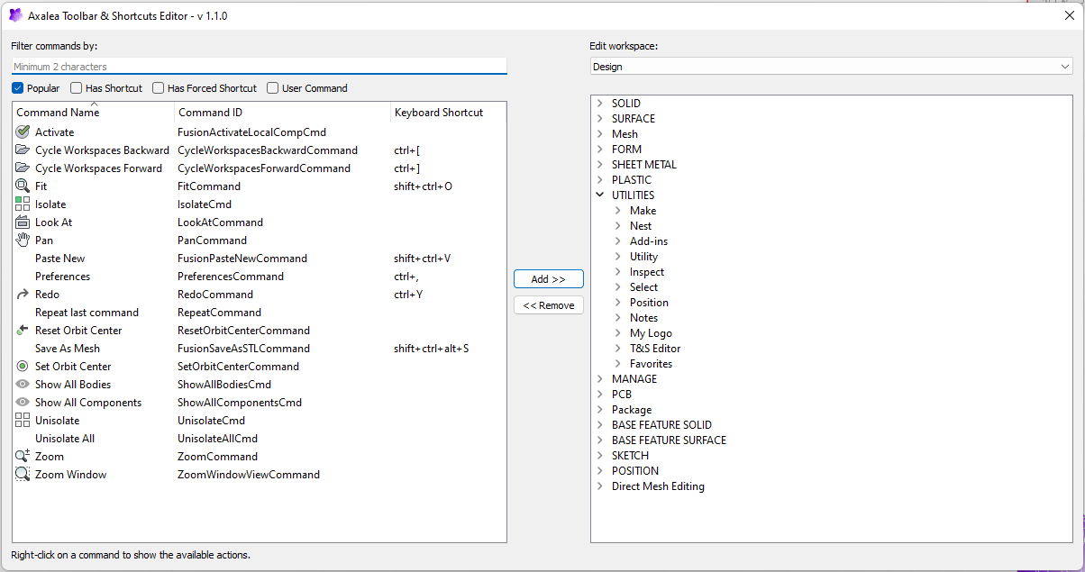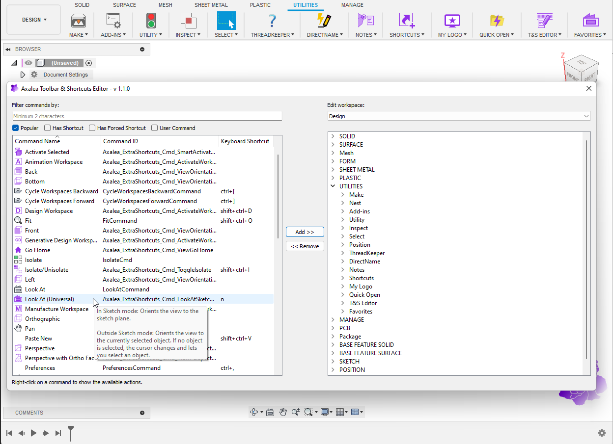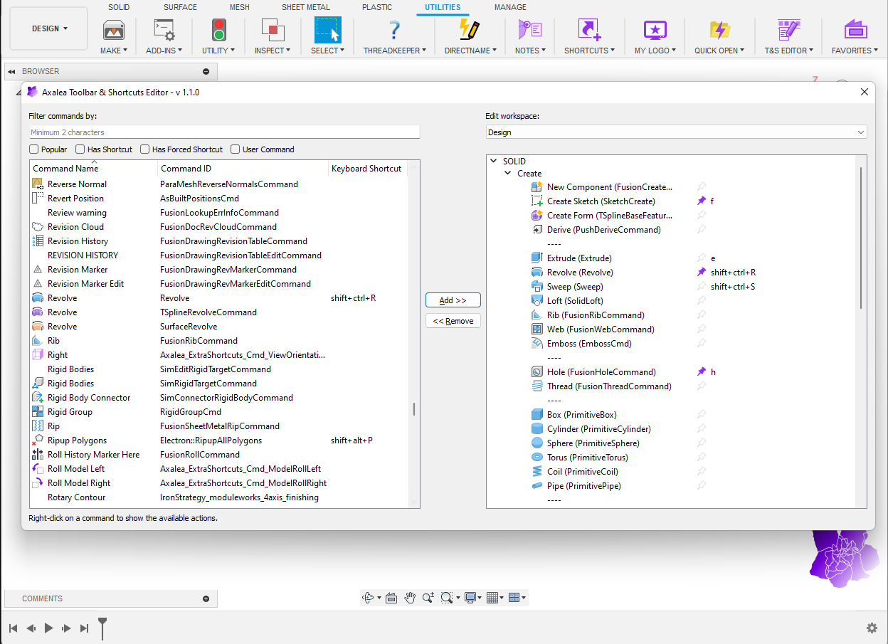 Toolbar & Shortcuts Editor allows you to easily manage and add keyboard shortcuts (hotkeys) to a large set of actions (commands) in Autodesk® Fusion®. Combined with Extra Shortcuts it can significantly speed up your workflow.