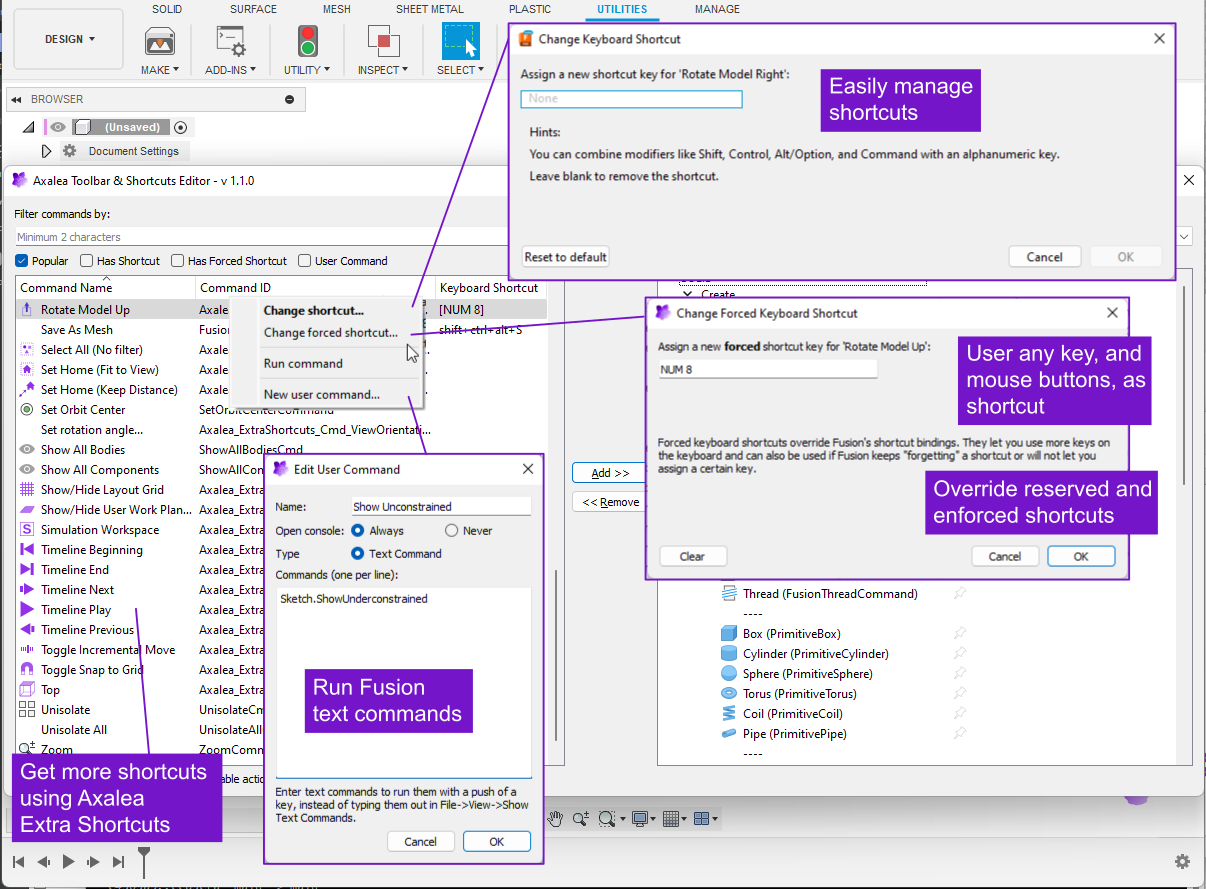 - Create keyboard shortcuts using any keyboard key, including some mouse buttons, and override unchangeable Fusion keyboard shortcuts (Does not work in the Drawing workspace). (Forced Shortcuts)