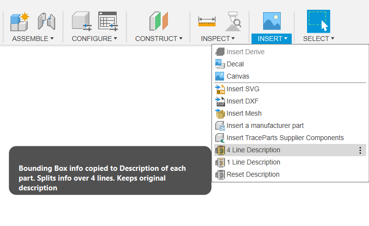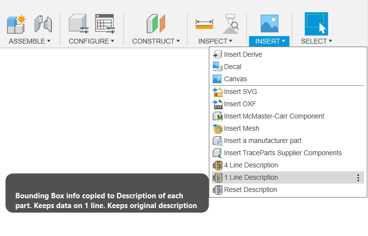 This app for Autodesk® Fusion 360® copies Bounding Box information to model Description.