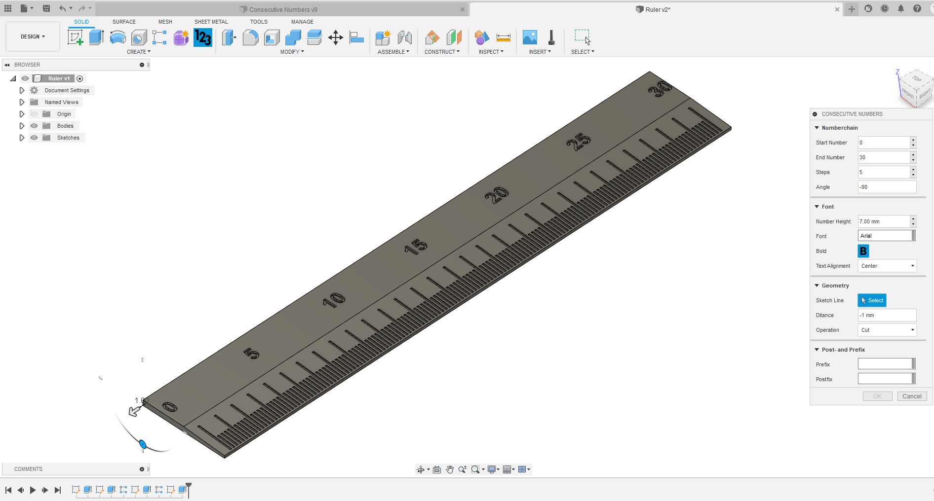 This app creates and extrudes a chain of numbers along a given sketch line. (For example a scaling)