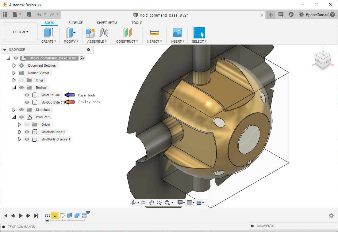 - Parting Split: Split the mold into two parts by the parting surface body.