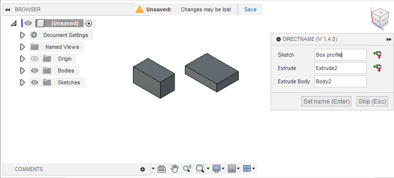 DirectName is an Autodesk® Fusion® add-in for naming features and bodies directly after creation.